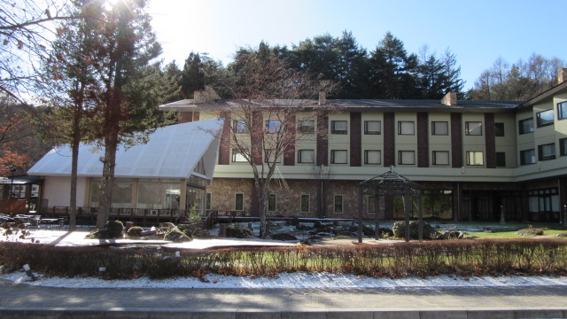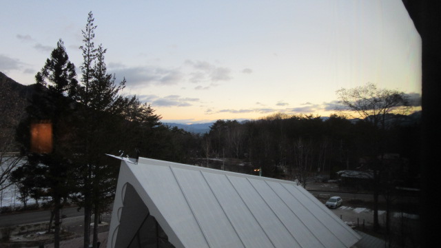 | リゾートホテルの深夜1時、広すぎて落ち着かない。6時には目覚める。窓の外には駒ヶ根高原が広がる。 |
