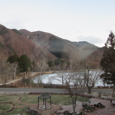 | ホテル前の駒が池。氷の張った水面をカモがゆったりと。遠く南アルプス方面は晴れているのかな? |