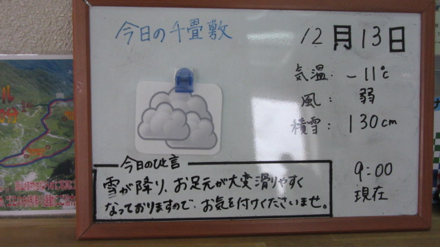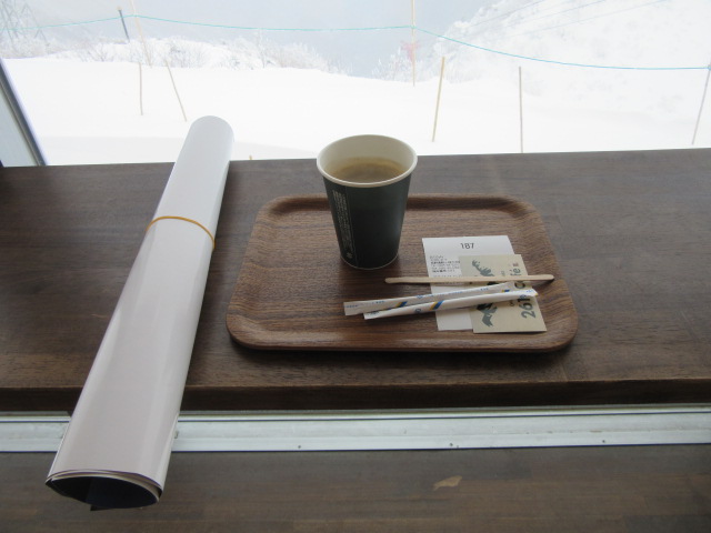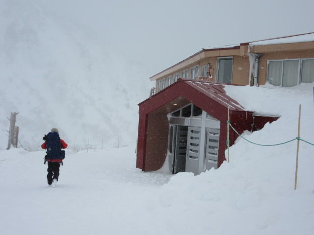 | 終点、千畳敷は厳寒の寒さ。粉雪が僅かに降り、風が吹くと雪が舞い上がる雪雲の中。珈琲が美味しい。 |