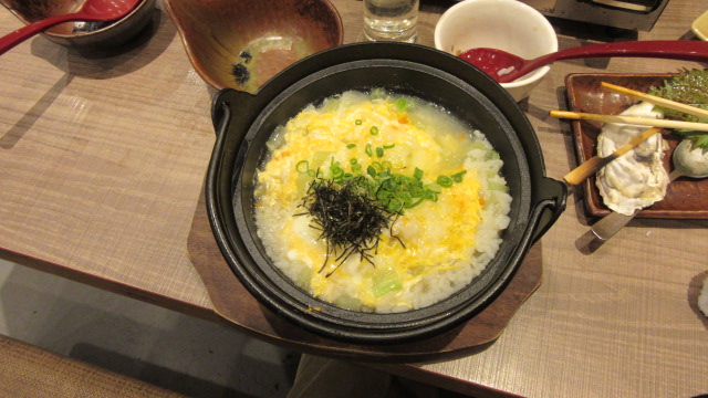 | 普段は呑まないけれど、酒の肴が孝子さんだと二杯目お代りです。〆は雑炊とスィーツです(^_^)v |