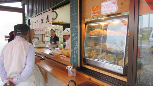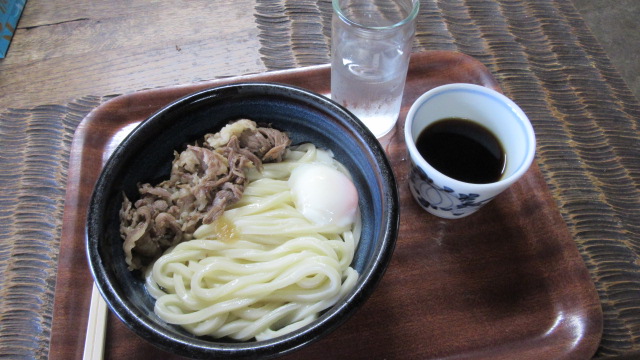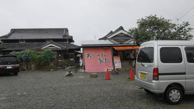 | 二時間かけてたどり着いたのは、丸亀市郊外の『あやうた製麺』です。 カーナビ装備でも不安です。 田園風景の中の古民家の納屋を、改装したものです。 一番の名物『オリーブ牛肉温玉ぶっかけ』を注文。 |
