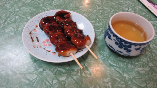 | 孝子さんが里帰りの際に寄られた和泉屋さん。先日食べられたお団子を頂く。女将さんとしばし談笑。 |